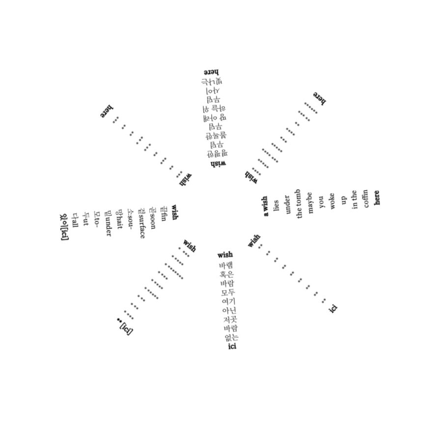 Wonwoo Kim sculpte la langue comme une matière graphique. Chaque poème est une figure mouvante, entre texte et image, où l’agencement visuel est porteur de sens. Certaines pages rayonnent en rosaces multilingues, d’autres se contractent en entonnoirs vers un centre sombre ; ailleurs, des cercles comme une onde sonore ; parfois le texte se déploie en colonnes brisées ou en pyramides fragiles. Autant de configurations qui transforment la lecture en exploration.